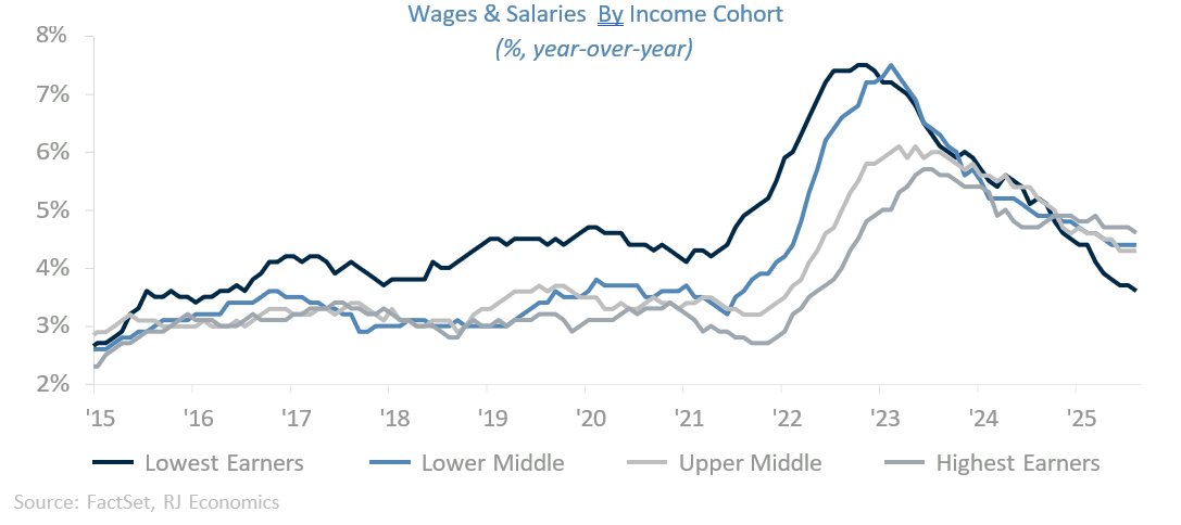 However, the similarities probably end there. The numbers above are aggregate numbers and don’t show what is happening with the different household income groups of the economy. The current environment has been very different for lower-to-middle income households than was the case during the recovery from the pandemic recession. At that time, lower-to-middle-income earners were benefiting from a strong labor market and a strong increase in wages and salaries. This, however, is not the case today, as the graph below clearly shows.